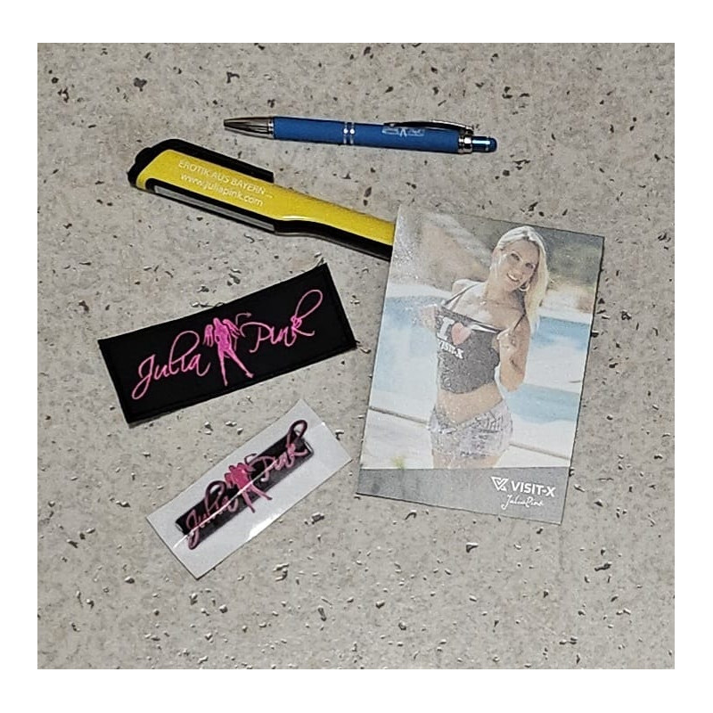 Freue dich auf einen kugelschreiber, taschenlampe, aufnäher, aufkleber und eine Autogrammkarte.